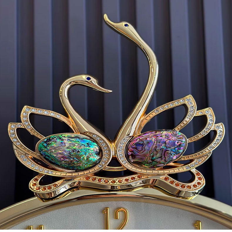 Phần khẩm trai lớn được chế tác tinh xảo và trang trí đính vào cặp thiên nga tôn lên vẻ đẹp quý phái và nỗi bật cho phần đồng hồ. Với việc chọn lựa khảm trai thì sản phẩm đồng hồ này có màu sắc đa dạng và đổi màu theo nhiều kiếu khách nhau dưới màu sắc của đèn trần cũng như góc đứng nhìn